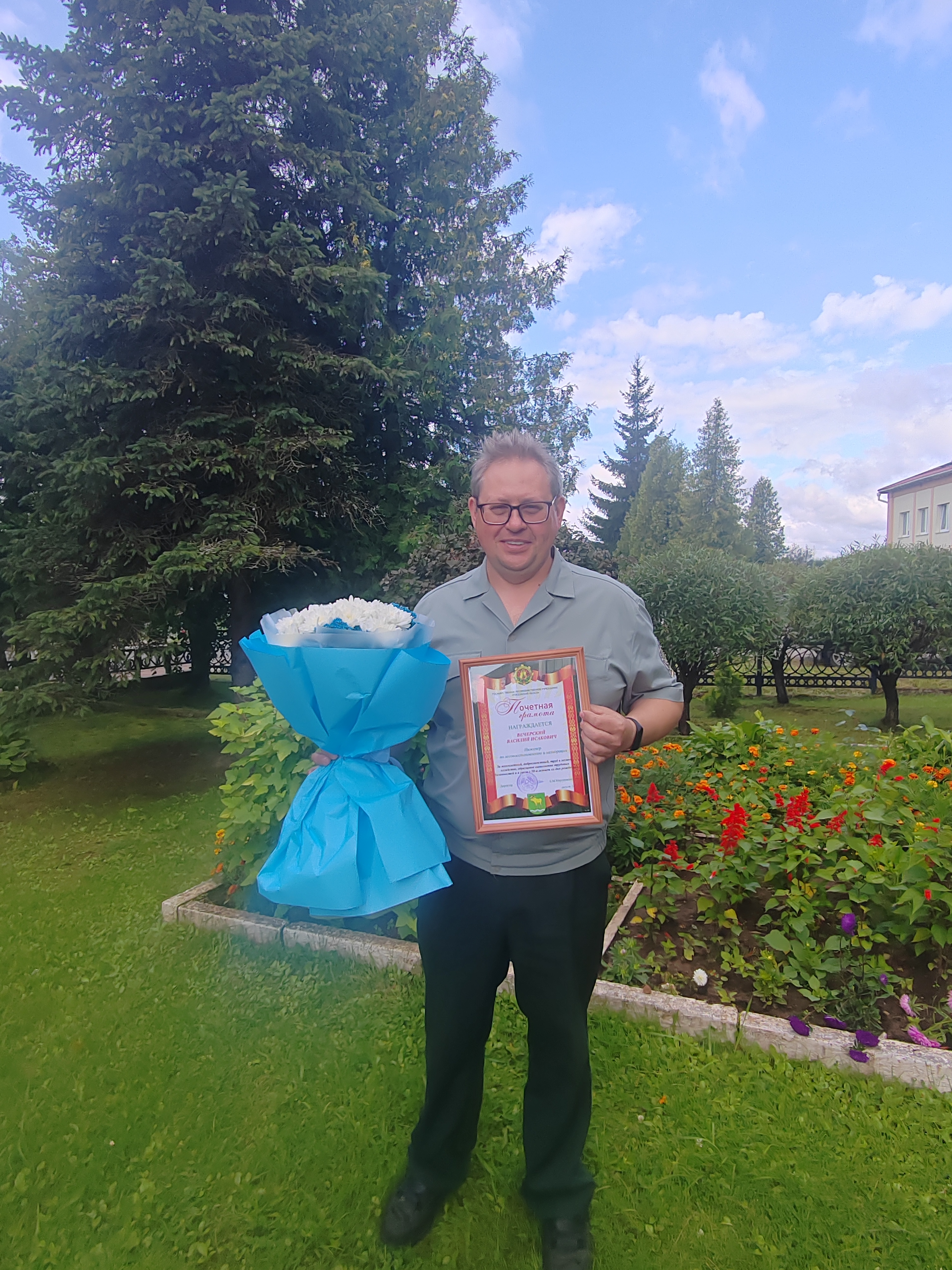 За многолетний добросовестный труд в лесном хозяйстве, большой личный вклад в сохранение, воспроизводство и приумножение лесных богатств, образцовое выполнение должностных обязанностей и в связи с юбилеем вручил имениннику Почётную грамоту Россонского лесхоза.